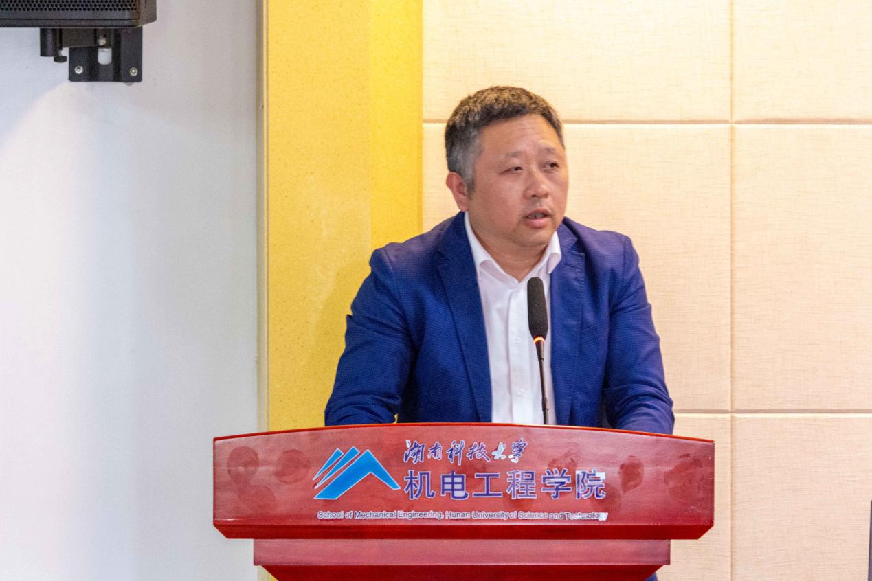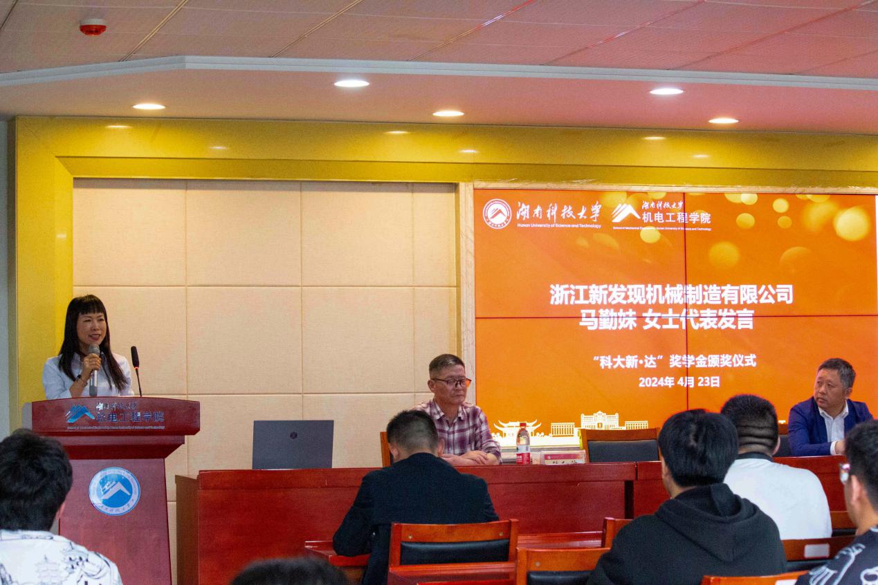 马勤妹上台发言,她介绍了公司的发展现状,阐述了设立“科大新·达”奖学金开展校企合作的意义,表达了公司对机械领域人才的渴求,希望通过校企合作方式,提升人才培养效果,助力企业科技进步与发展,实现校企双赢。