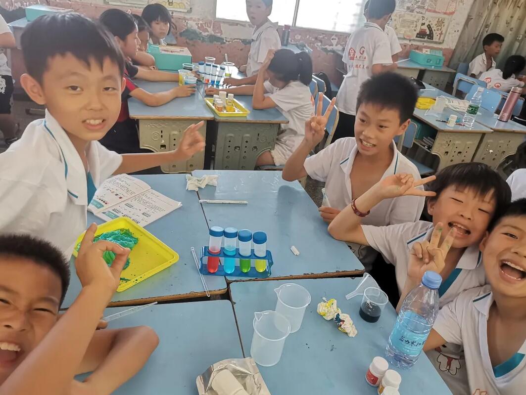 在之后的课程中,丁凯泽同学在课堂上总是会高高的举起自己的手,不管正确与否,都会提出自己的看法,给出自己的答案。在实验环节中,他和组员们一同交流,合理分工,又快又好的完成了每一个实验。下课后,支教者们问他对夏令营有没有新的感受,他说:“在课堂上学会了很多,通过实验,也能够探索知识,现在有了满满的成就感。”